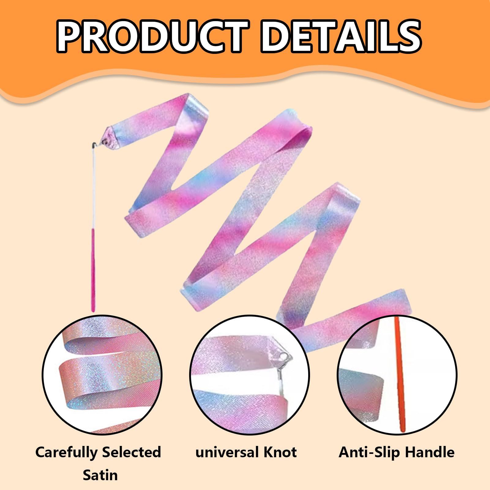Questo set di 4 nastri per danza ritmica è tutto ciò che ti serve per esibizioni fluide e colorate! Ogni nastro, lungo 200 cm e largo 4,5 cm, è in seta di qualità e fibra di vetro, con un bastoncino di 30 cm rivestito in plastica rossa per una presa comoda e antiscivolo. L'anello di metallo sulla parte superiore permette rotazioni fluide senza blocchi. Perfetti per bambini e adulti, si usano in ginnastica ritmica, twirling, balletto, spettacoli di talento e perfino nelle feste. Un modo divertente ed elegante per esprimere la creatività attraverso il movimento!